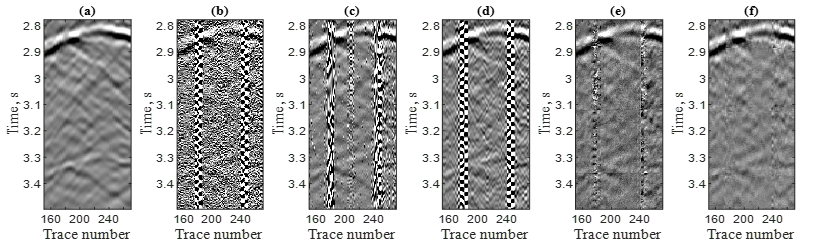 深层弱信号DAS-VSP 数据去噪结果. (a)干净数据;(b)噪声数据(-17.6 dB);(c)EMD方法去噪结果(0.2 dB);(d) FK方法去噪结果(0.1 dB);(e)本方法在时间域去噪结果(2.1 dB);(f)本方法在频率域去噪结果(5.3 dB),信噪比提高22.9 dB.