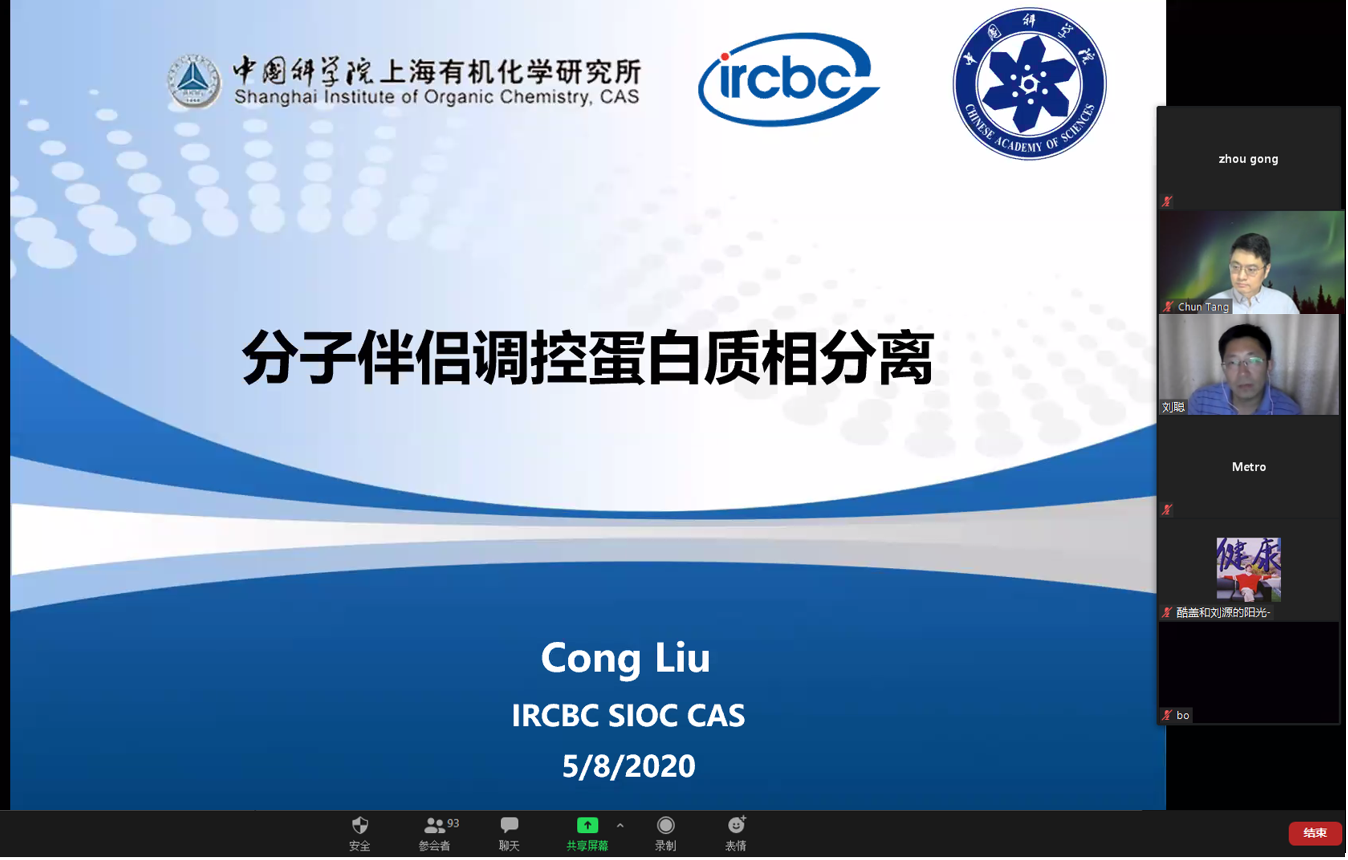 5月8日晚7:30,中国科研实验室生物磁共振与多学科交叉系列学术报告第一场在ZOOM线上会议平台正式拉开帷幕。应EVO视讯官网唐淳研究员邀请,中国科研实验室上海有机化学研究所刘聪研究员作为报告主讲人,带来了题为“分子伴侣调控蛋白质相分离”的专题学术报告。刘聪研究员从开展蛋白质相分离的高通量筛选方法以及分子伴侣调控蛋白质相分离的应用研究两个方面,深入浅出的分享了课题组近年来在蛋白质相分离方面的研究进展。来自全国各地以及海外的近百名科研工作者共聚线上,参与了学术研讨和讨论。