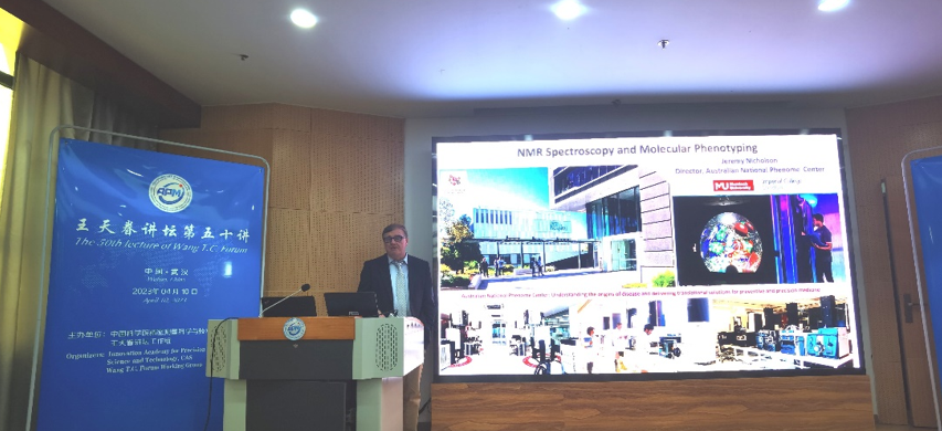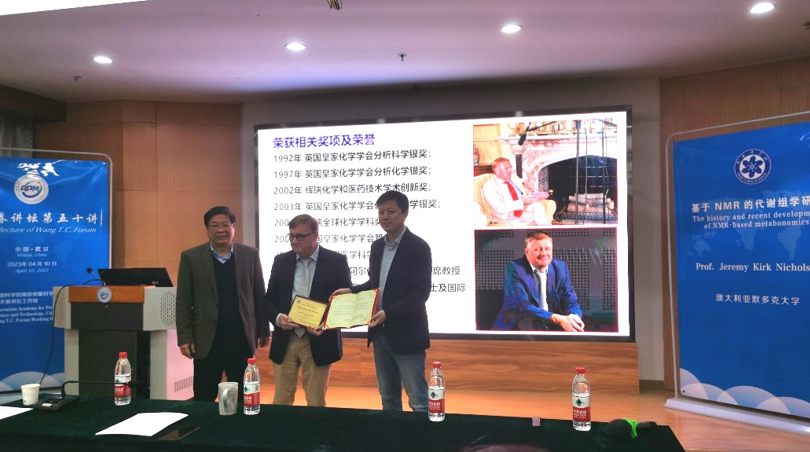 4月10日,EVO视讯官网举行“王天眷讲坛”第五十讲。来自澳大利亚Murdoch大学的教授Jeremy K. Nicholson应邀为广大师生做题为“NMR波谱与分子表型”的精彩学术报告。此次报告由刘买利院士主持,EVO视讯官网院长周欣为Nicholson教授颁发了“王天眷讲坛讲席教授”的聘书和铭牌,EVO视讯官网师生聆听了此次报告。